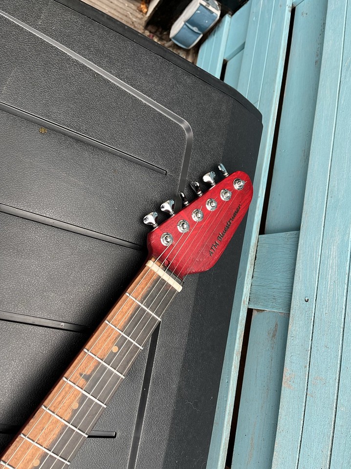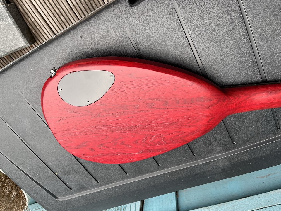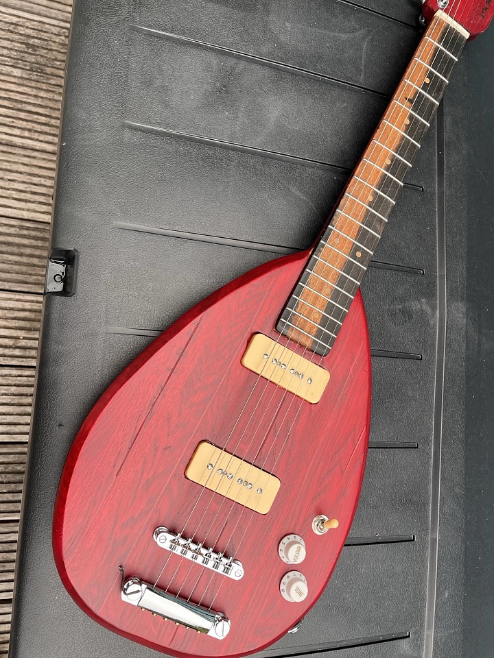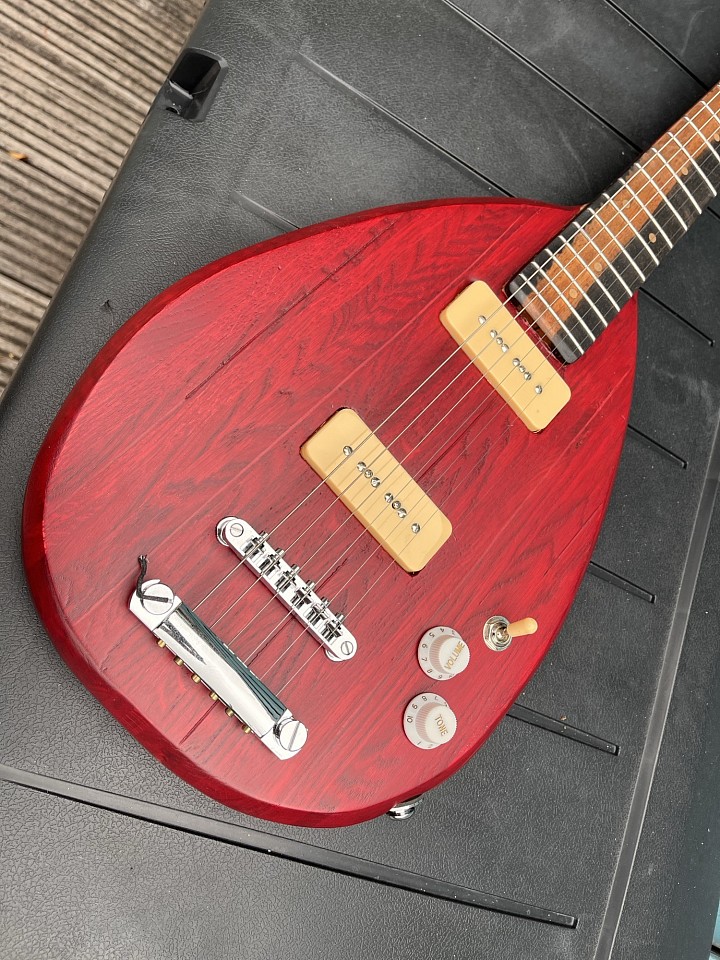 Nr #68 - restant latjes eiken verlijmd tot een plank, dan uit één stuk body en arm gemaakt, body in de vorm van de iconische Vox teardrop gitaren. Fretboard van ebbenhout. Gekleurd met rode inkt en vervolgens blanke lak eroverheen. Twee P90 clone elementen, wat electronica, et voilà, een ietwat zware elektrische gitaar.