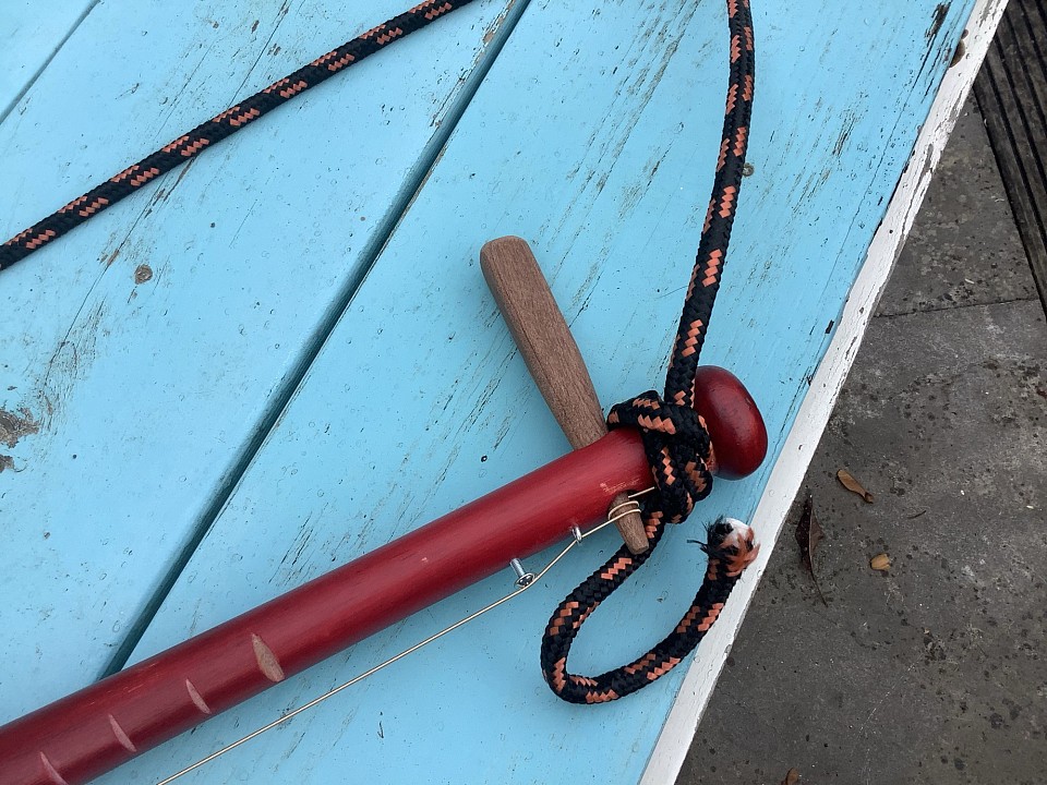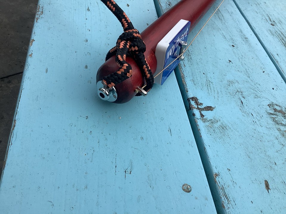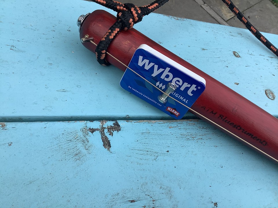 Nr #69 - Een oude honkbalknuppel, geschuurd, gekleurd met rode inkt, vervolgens blanke lak, een piëzo element, een dropblikje, een old fashioned handgemaakte stemsleutel, et voilà, een onhandig vast te houden diddley bow met een ruw en vet geluid.